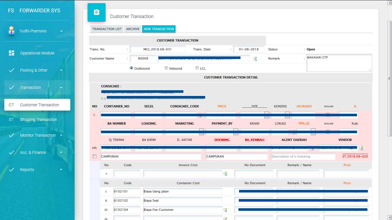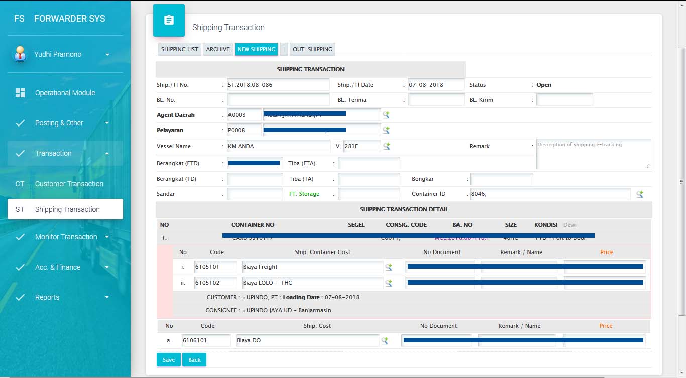 Pengelolaan Data Transaction Pengiriman : Select Agent Daerah, Pelayaran, Vessel, Date Berangkat, Tiba, Sandar & Bongkar, Entry cost per item, Cetak Shipping Trasaction, Manivest/ Trucking Instruction dan Berita Acara