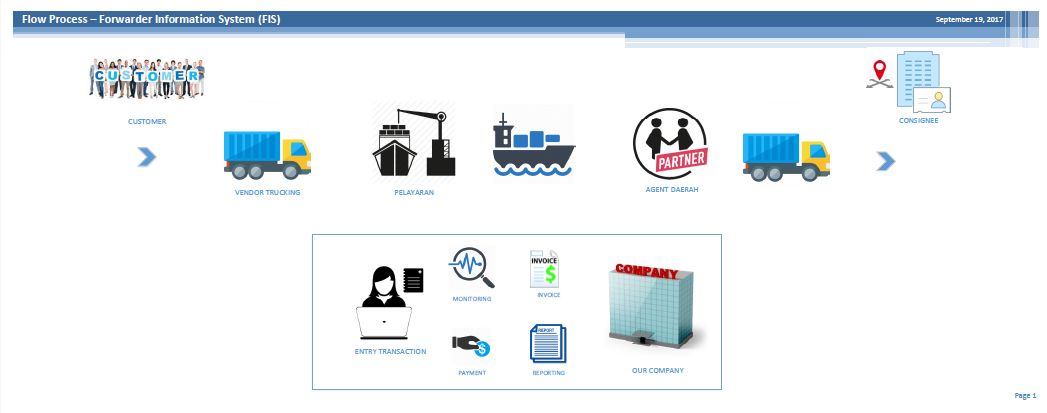 Forwarding Information System (FIS) merupakan system informasi yang mengelola data freight forwarding, mulai dari pengelolaan master data customer, agent daerah, pelayaran, vendor trucking, consignee dan juga pengelolaan Job Order transaksi secara digital dan dapat langsung cetak dokemen baik shipping instruction, manivest/ trucking instruction, berita acara sampai dengan monitoring transaksi pengiriman container sampai dengan pengelolaan data keuangan yang saling terintegrasi.