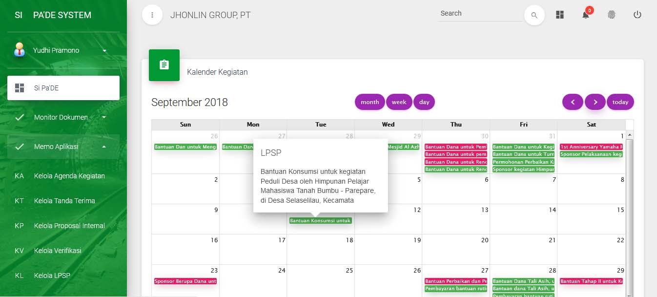 Monitoring dengan menggunakan Kalender Kegiatan berbentuk visual : Agenda, LPSP, Memo Dinas, Verifikasi, dan juga Proposal Internal